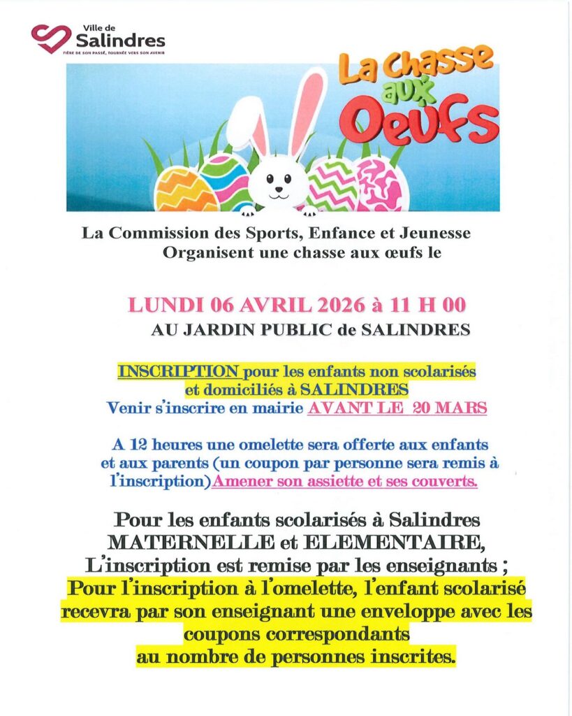 La chasse aux œufs et l’omelette sont ouvertes uniquement aux enfants inscrits et à leurs parents accompagnateurs (voir les modalités sur l’affiche ci-dessous ).
